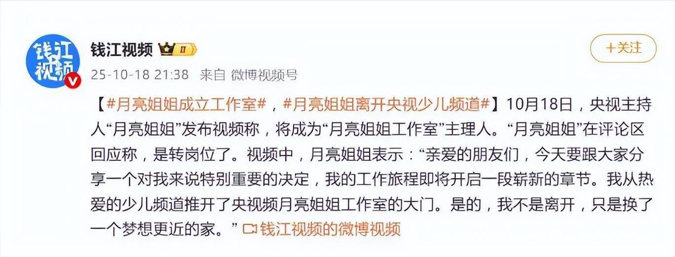 两个月后,月亮姐姐自己宣布了离开央视少儿频道这个消息,