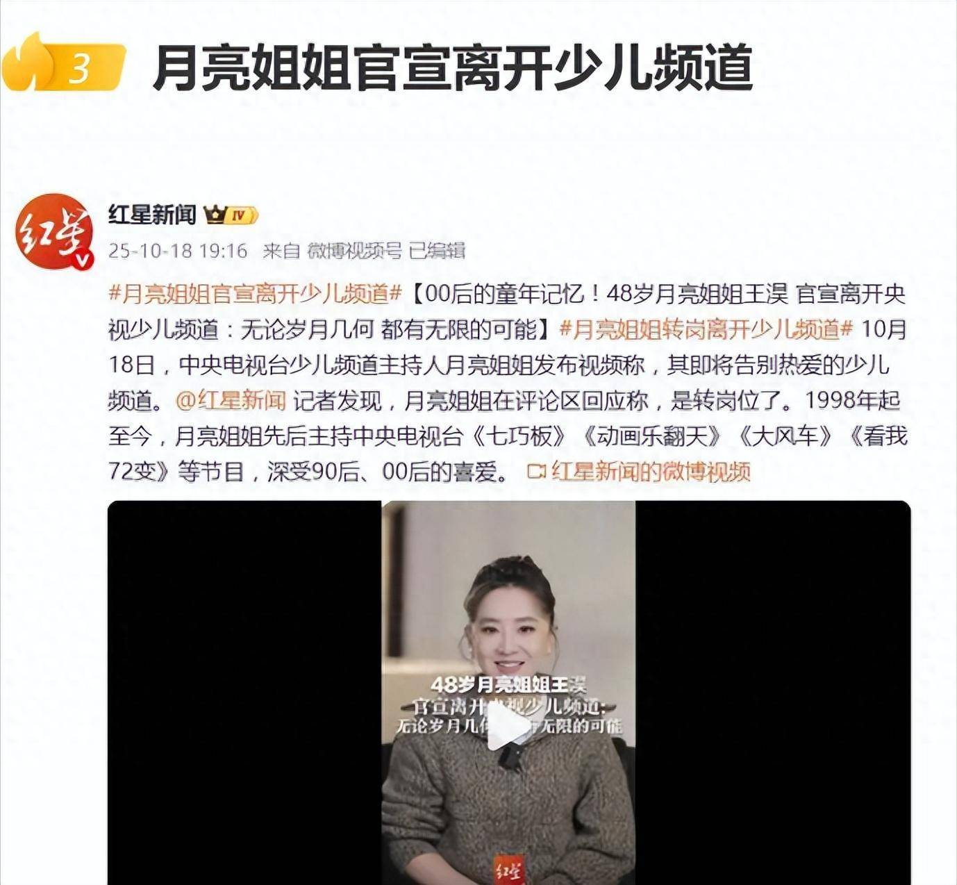 10月18日,月亮姐姐以视频形式向大家宣布即将离开央视少儿频道,
